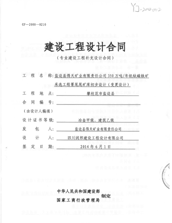 鹽邊縣得天礦業(yè)有限責(zé)任公司350萬(wàn)噸每年釩鈦磁鐵礦采選工程箐尾尾礦庫(kù)初步設(shè)計(jì)(變更設(shè)計(jì))